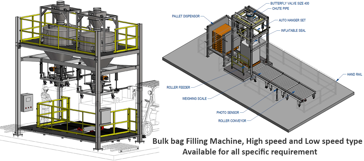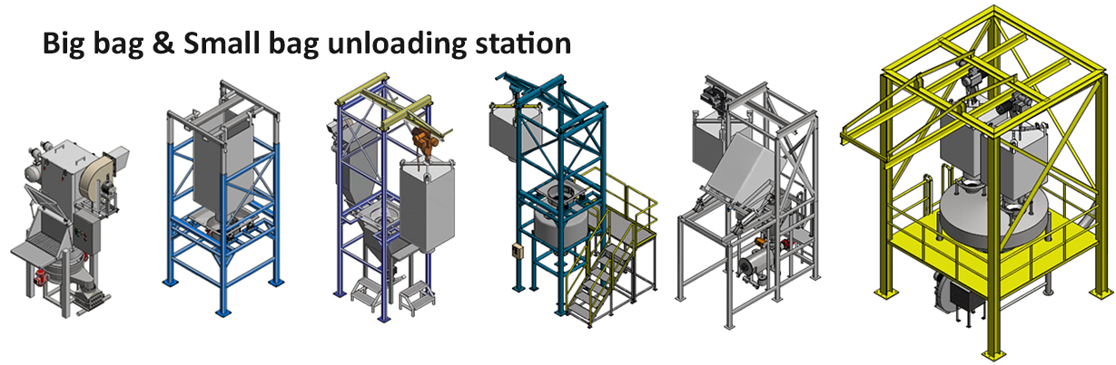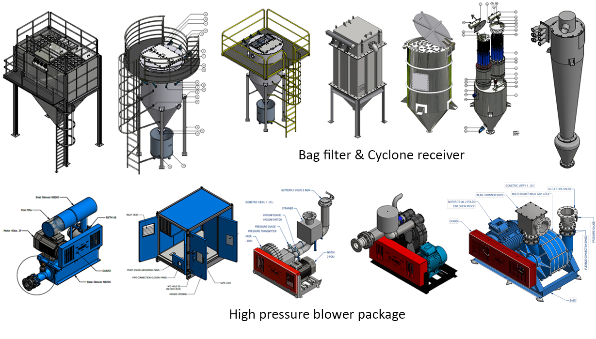 High pressure blower and exhauster package / Dust collecting Cyclone and Bag filter / Mixing machines / Big bag filling machine , Bulk bag unloading station. / Weighting scale and Load cell. |