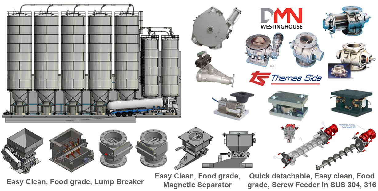 Rotary & Diverter valve, Slide gate valve / Food grade easy clean screw conveyor for food and chemical industry / Sizes reduction machines, Fine grinding, Coarse grinding and Lump breaking machine / Stainless steel and Aluminium Silos & Hopper |