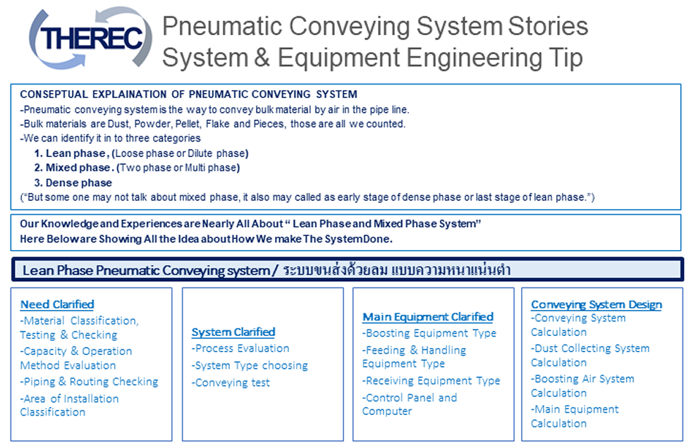 THEREC CORPORATION LTD. - has the highest experience in design and built pneumatic conveying systems to transfer several types of bulk material in the widely used of industrial needs. Nearly hundred of our reference in Thailand is the best prove for the trust of our name in the market.